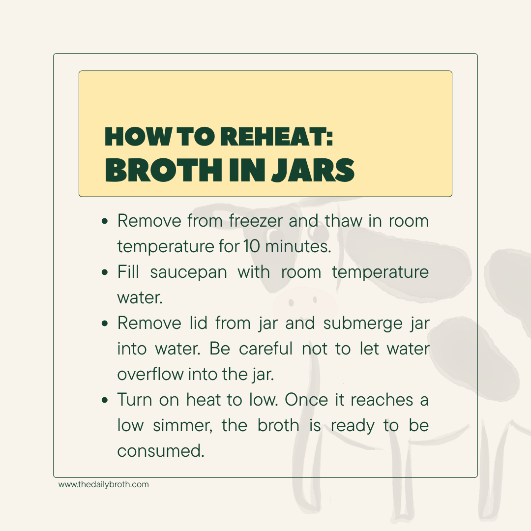 You can consume our broth daily, once it is heated. This is the recommended dosage, especially if you have certain health conditions. Our Clear & Classic version can be used for cooking, as a substitute for stock in recipes.
